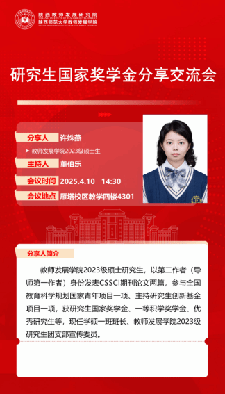 本次分享交流会邀请到公司2024年国家奖学金获得者,2023级教育经济与管理专业硕士生许姝燕同学进行经验分享。