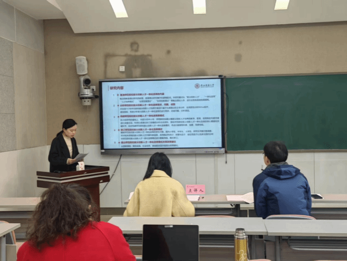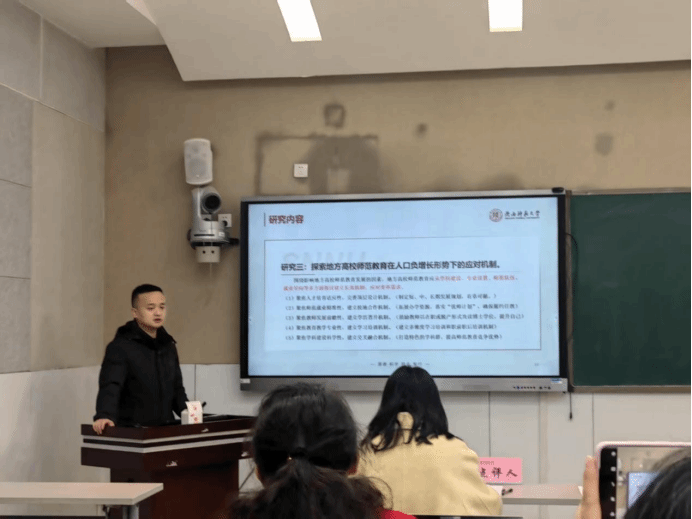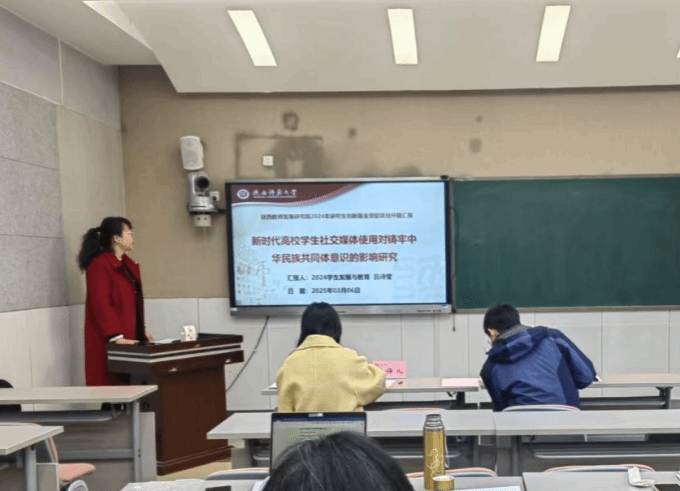 廖鑫、吕诗莹、刘丽、翟晓甜四位项目负责人依次就《人口负增长背景下陕西地方高校师范教育变革应对机制研究》《新时代高校员工社交媒体使用对铸牢中华民族共同体意识的影响研究》《师范院校拔尖创新人才一体化选育路径研究》《中华诗教传统涵育当代德育研究》等课题进行了汇报。围绕项目的选题背景和意义、选题目的、研究内容、研究过程与方法以及论文的创新点等核心问题进行了阐述。