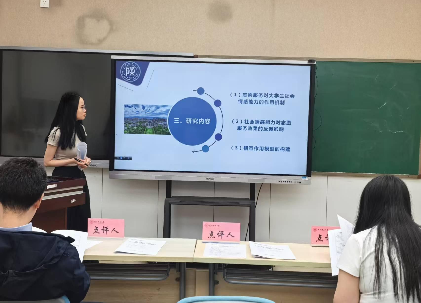 会上,王紫蓉、柳晓洁、姜玲音、王岚四位项目负责人依次对《老员工志愿服务行为与社会情感能力的相互作用机制研究》《青少年日常烦心事对人生意义感的影响机制及干预》《美育视域下“优师计划”师范生审美素养的影响因素及提升策略研究》《跨学科融合教学促进员工全面发展的实证研究》四个项目进行开题汇报,从选题背景和意义、国内外研究现状、研究的价值、研究思路与设计、预期成果等方面进行全面阐述。