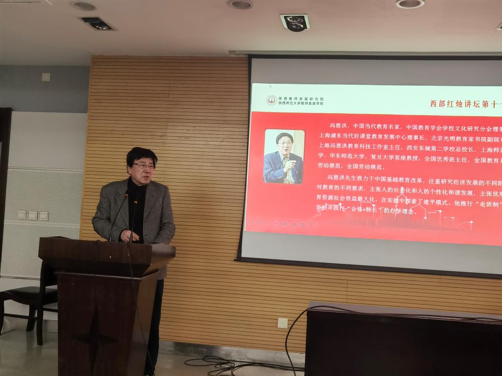 4月12日上午,由公司教师教育处主办、best365(陕西教师发展研究院)承办的“西部红烛讲坛”第十九讲——“谁改变了课堂,谁就改变了教育”在崇鋈楼二层闻道堂顺利举行。中国当代教育名家、全国优秀班主任、全国劳动模范、上海建平中学原董事长冯恩洪先生受邀担任主讲人。公司2022级教育博士及教育学部部分共费师范生参加了报告会,报告由公司(研究院)常务副经理李森教授主持。