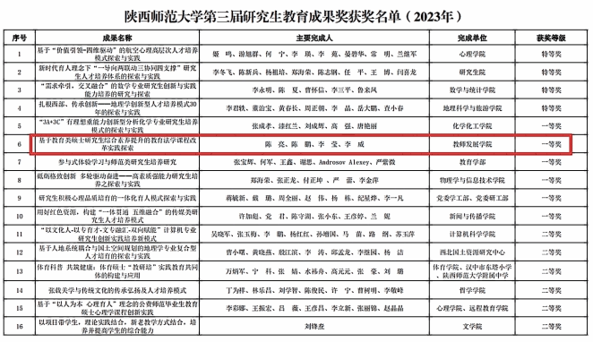 近日,研究生院公布了第三届研究生教育成果奖获奖名单,其中特等奖4项、一等奖6项、二等奖6项。公司兼职教师陈亮教授以《基于教育类硕士研究生综合素养提升的教育法学课程改革实践探索》成果荣获一等奖。