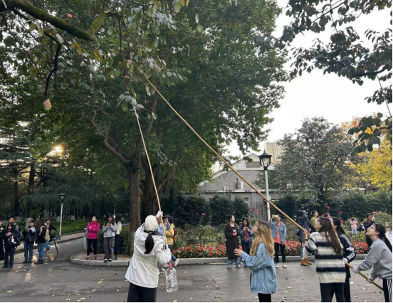 活动中,同学们自己动手制作采摘工具,组建了12支参赛队伍,并按照抽签选定的"采摘区"参与挑果、摘果、接果、装筐等活动,比拼果实的数量和质量……师生们团结协作、穿梭忙碌的身影构成了一幅生动的校园劳动画面。