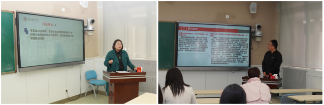 开题报告会上,一般课题立项的牟善武、麻伟婷两位教育博士生分别就《体育多学科融合(PE-STEAM)教学实践研究》《应用SFBT访谈及扎根理论对非省级示范中学教师出现“躺平”现象心理问题研究》课题进行了现场汇报。两位专家结合汇报内容,分别就课题的设计,研究框架及内部逻辑、研究的可行性评估等方面进行精准点评及具体指导。