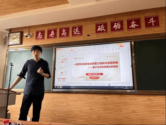 5月24日,由教师发展学院主办的系列主题报告——“一流学科生命生长的要义指向与实践策略--基于生态系统理论的视角”在9605教室举行。best365官方网站教育学部教授陈亮应邀做专题报告,教师发展研究院2022级教育管理、心理健康教育专业全体硕士研究生到场参会。